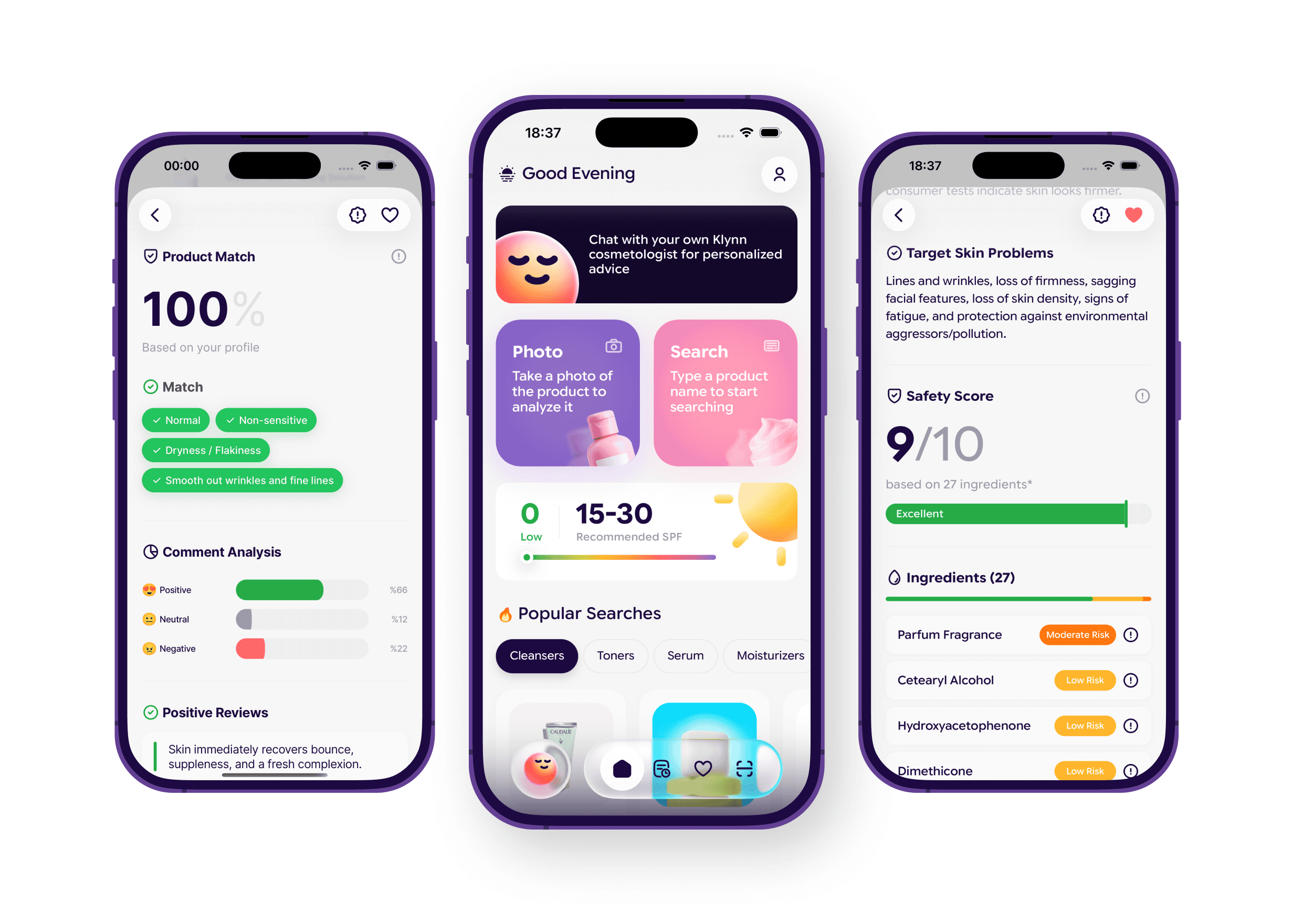 Klynn analyzes any skincare or cosmetic product on the web in real time — far beyond static databases. It pulls ingredient data, formulations, and real user reviews from trusted sources to help you make confident skincare decisions based on real experiences, not marketing claims.