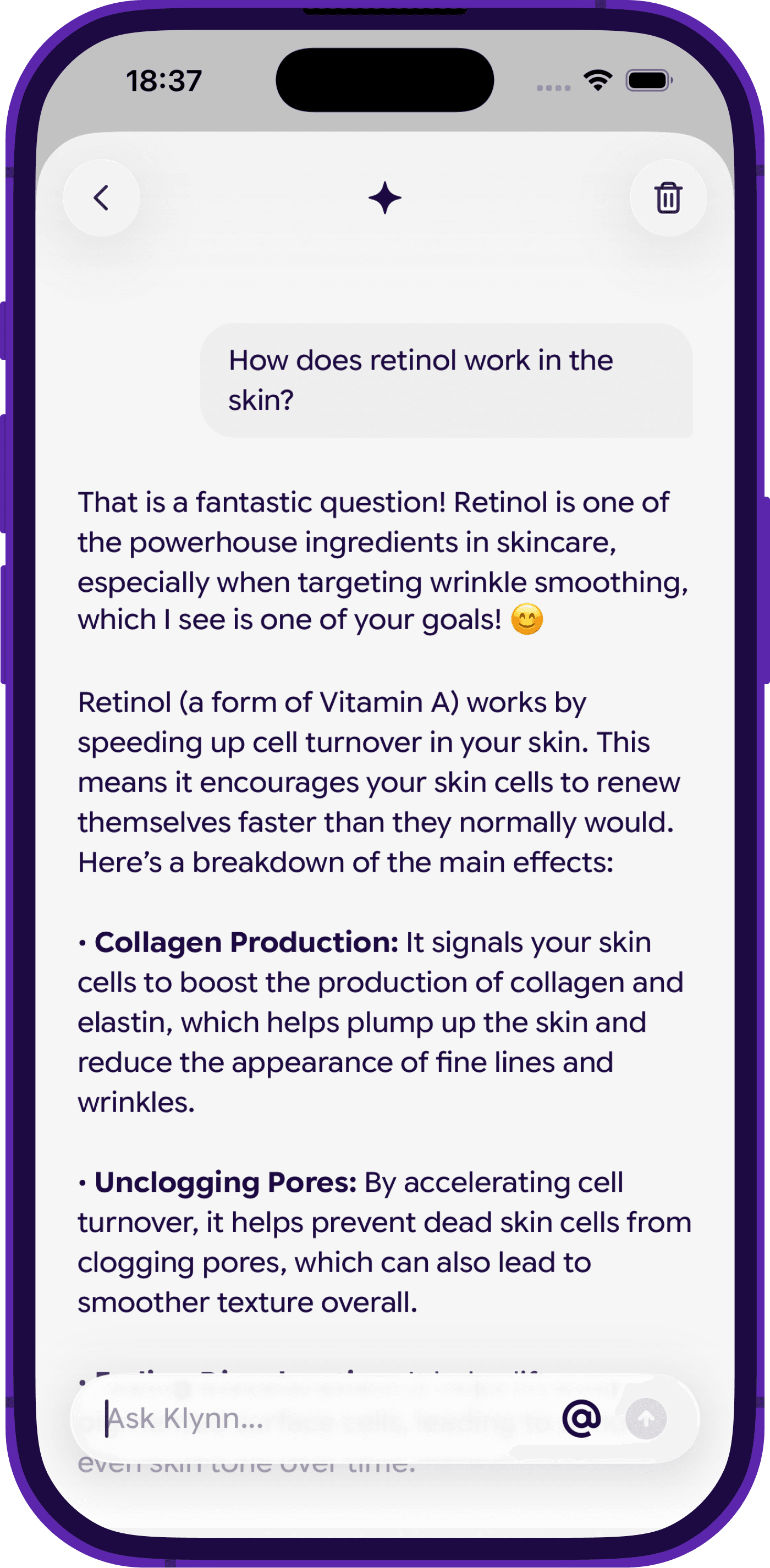 Not a generic AI. Klynn understands ingredients, formulations, routines, and skin concerns — so answers are relevant, not generic.